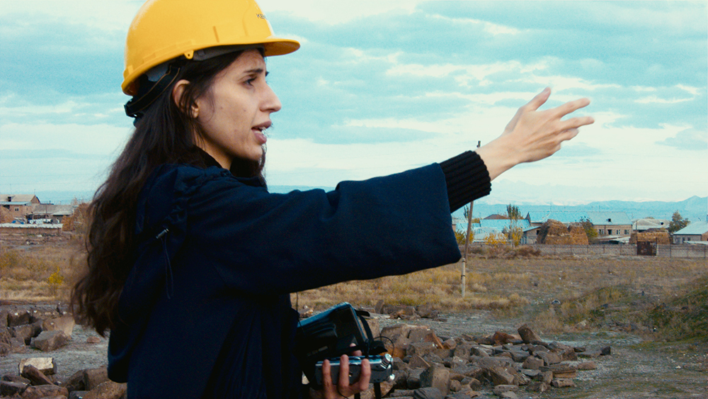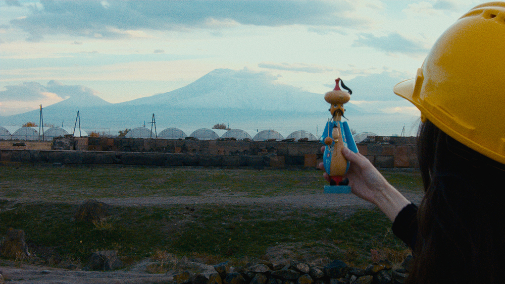 Video still. Gebirge in der Nähe von Yerevan. Meine Figur, Valentina Nergararian, eine armenische Immobilienentwicklerin und kreative Partnerin in einer fiktiven Kooperation zwischen dem Erzgebirge und Eriwan, schaut auf eine Erzgebirgskarte. Aus dem Projekt "Kopie des Erzgebirges im sogenannten Fernen Osten" (AT).